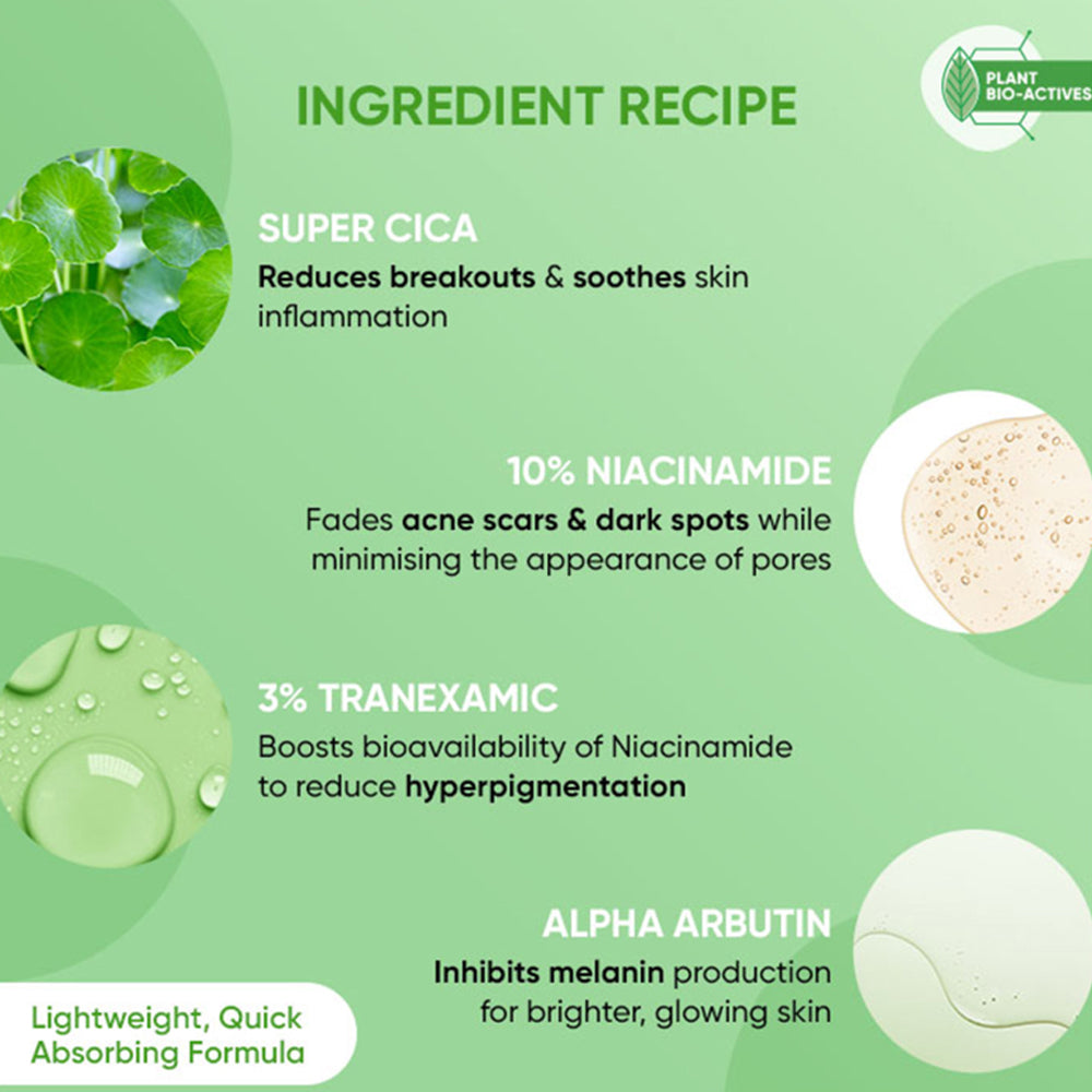 - 10 percent niacinamide, CICA and 3 percent tranexamic target dark spots.