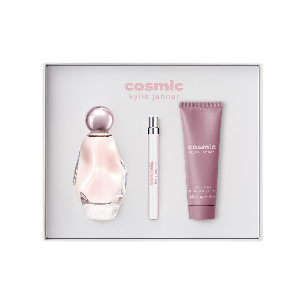 Indulge in the warm floral, skin-inspired scent of cosmic kylie jenner with this perfume and body lotion gift set featuring the eau de parfum in a 3.3oz bottle and a travel-sized pen spray for on-the-go, along with a 2.5oz body lotion. all of them blossom with notes of star jasmine, blood orange, and accords of golden amber and vanilla musk. the body lotion leaves the skin feeling hydrated and velvety soft, while the perfume bottle is designed to fit perfectly in the palm of your hand. this eau de parfum gift set includes the following: - cosmic kylie jenner eau de parfum spray, 3.3oz - cosmic kylie jenner body lotion, 2.5oz - cosmic kylie jenner pen spray, 0.33oz cosmic kylie jenner perfume key notes: - opening: star jasmine and blood orange - heart: golden amber accord and red peony accord - base: vanilla musk accord and cedarwood fragrance family: ambery floral