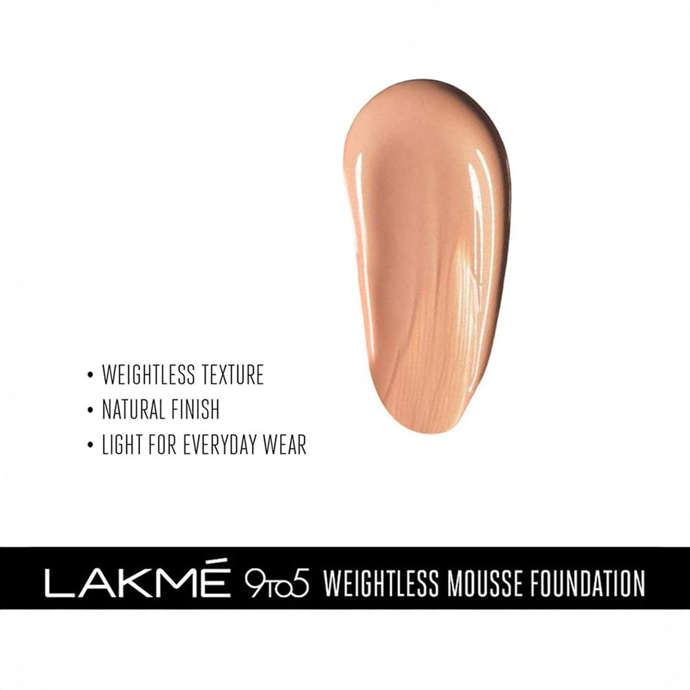 Lakme 9 To 5 Weightless Mousse Foundation Is Your Answer To A Workings Women’S Barrier To Using Foundation. It Is A Lightweight Foundation Meant For Everyday Use. It Is So Lightweight That You Won’T Even Feel You Are Wearing Foundation. It Not Only Blends In Effortlessly But Gives A Matte Finish That Lasts Through The Day. It Is Available In 4 Shades And Is Extremely Convenient To Carry. Foundation With A New Formula That Feels Soft And Incredibly Weightless And Is Perfect For Everyday Office Use. It Blends Effortlessly Onto Skin To Conceal Imperfections With A Matte Finish That Stays Through The Day. With Complete Coverage It’S A Foundation So Weightless You Will Forget You Are Wearing Any Foundation, Matte Finish In A Weightless Mousse Texture, Pocket Sized Tube That Is Easy To Carry Around, Complete Coverage, Lightweight And Long Wear. Available In 4 Office-Wear Shades – Rose Ivory, Beige Vanilla, Beige Caramel And Rose Honey. Suitable For All Skin Types. Dermatologically Tested. How To Apply: Step 1: Just Take A Small Amount Of Product With The Index Finger And Start Applying It To The Skin With Your Fingertips. Usually, You Can Just Apply The Mousse In Four Places: The Forehead, Nose, Chin And Cheekbones. Blend Into Your Skin Starting From The Center Of The Skin Outwards, Taking Care To Cover Your Face Including Your Neck Step 2: Blend Into Your Skin Starting From The Center Of The Skin Outwards, Taking Care To Cover Your Face Including Your Neck.