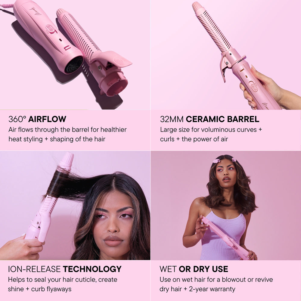 Introducing Aircurl™, our ultimate styling companion your locks have been longing for. Curl, shape and add volume with the power of air, rather than extreme heat. Suitable for dry or damp hair, simply wrap the hair around the barrel or clamp and roll the hair up and let the air set the curl. The clamp provides complete control to achieve waves, curls, ringlets or just mega volume. With three heat settings, 360° airflow, and a 30mm barrel, it instantly creates show-stopping shape that radiates confidence. Ionic technology also fights off frizz, while the cool-tip and heat-free handle makes styling a cinch. As we say, love is in the air!