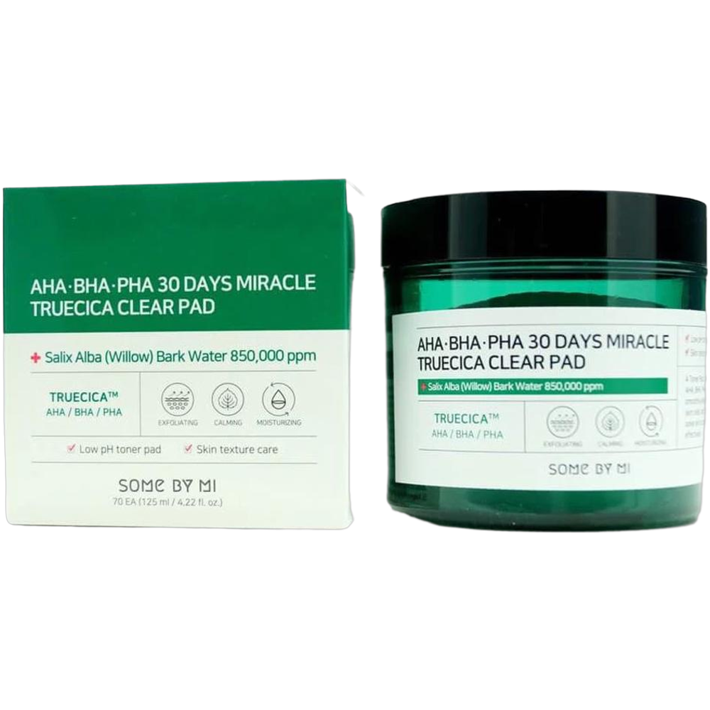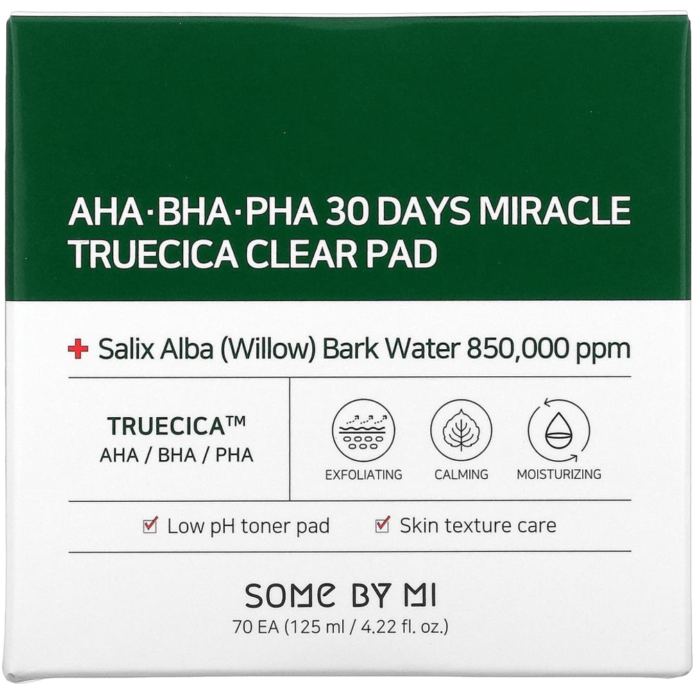 Introducing Some By Mi AHA-BHA-PHA 30 days miracle truecica clear pads, a transformative addition to your skincare routine. These pads combine the benefits of AHA, BHA, PHA exfoliants and the skin-repairing power of truecica to deliver a comprehensive solution for acne-prone and troubled skin. The textured pads gently exfoliate, unclog pores and soothe irritated skin, promoting a clearer complexion. Infused with tea tree leaf extract and centella asiatica, these pads target blemishes and calm redness, while truecica aids in repairing damaged skin. Perfect for daily use, the clear pads ensure consistent and effective care, providing visible results in just 30 days. Embrace the convenience of these pads for revitalized, blemish-free skin that shines with health.